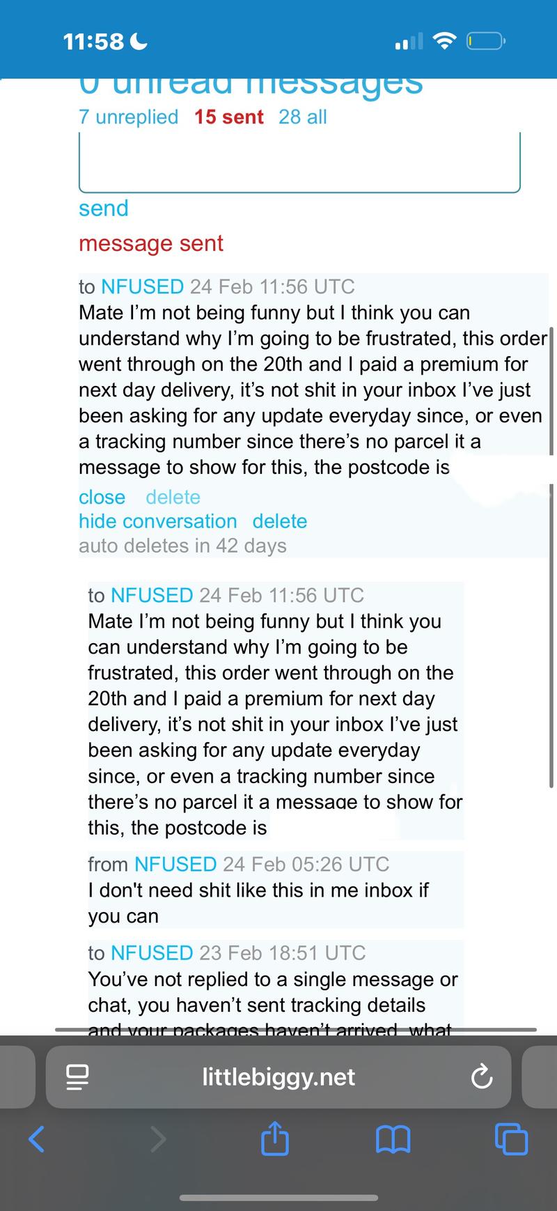 unbelievable service, awful, paid for NDD by 1pm and that was on February the 18th, it’s the 5th of march now, the seller “NFUSED” hasn’t been online in 9 days, 6 unread chats, it’s not like I’m the only one saying it, told him I wanted a tracking number and that it was a “sloppy operation” only reply I got back was that he didn’t want this “shit” in his inbox, what a joke.